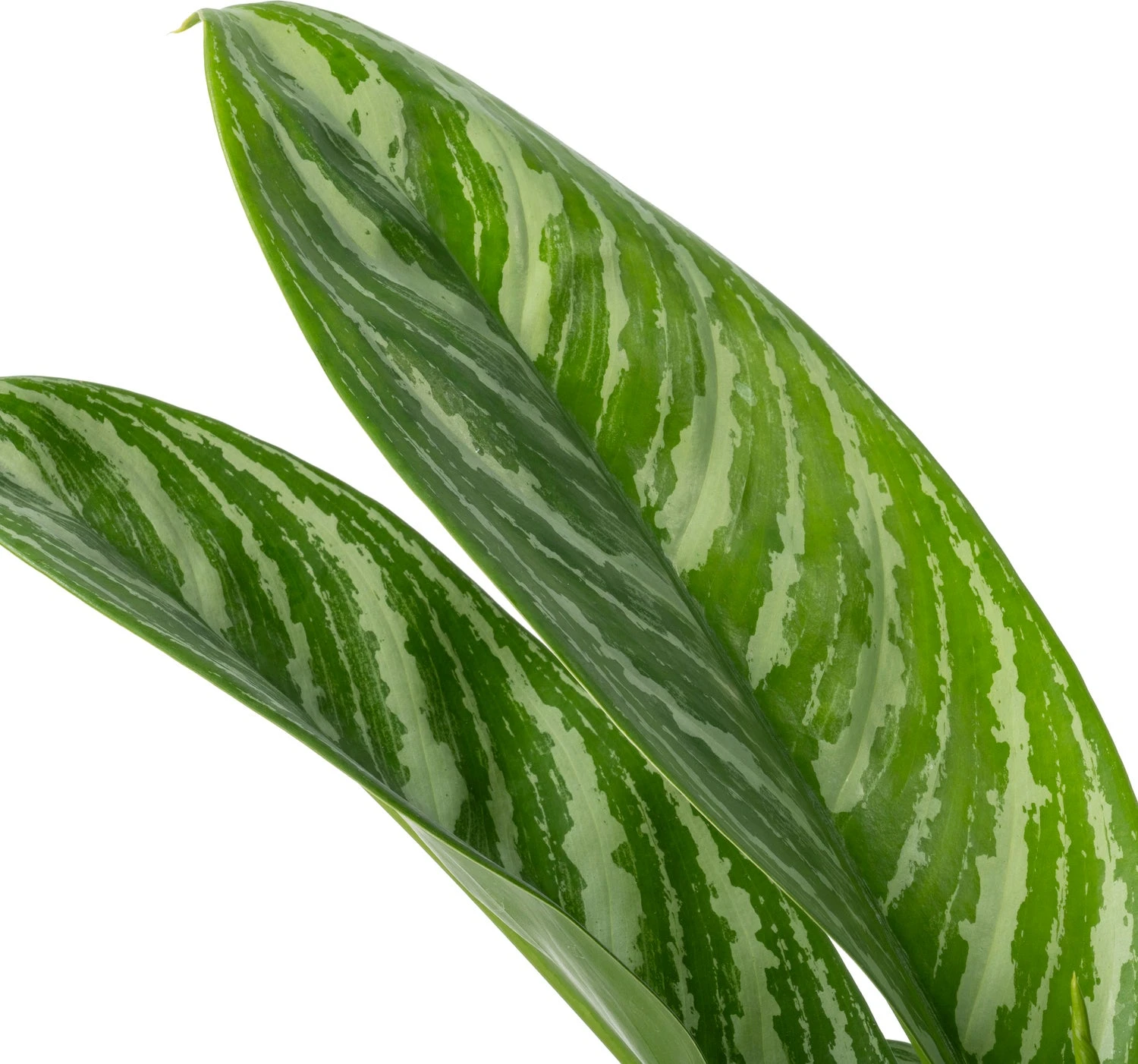 Net als de Dieffenbachia, Monstera en de Philodendron is deze Aglaonema een familielid van de aronskelkachtigen. Het blad is zeer decoratief en heeft vele soorten. Dit soort heeft lichtgroen blad met donkergroene strepen zoals Calathea’s dat ook hebben. De luchtzuiverende kwaliteiten maken deze plant nog mooier.