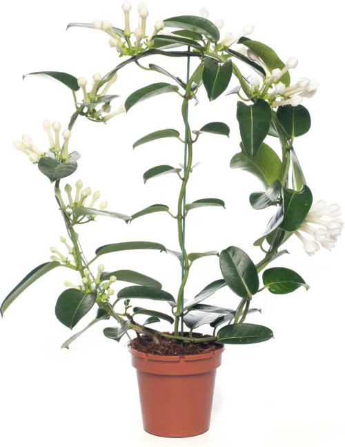 De Bruidsbloem, ook wel bekend als Stephanotis floribunda, is een betoverende kamerplant afkomstig uit Madagascar. Deze plant, die tot de familie van de zijdeplanten behoort, is beroemd om zijn schitterende witte buisvormige bloemen die een heerlijke geur verspreiden. Met zijn glanzende, leerachtige groene bladeren en elegante bloemen, vormt de Bruidsbloem een prachtige toevoeging aan elk interieur.