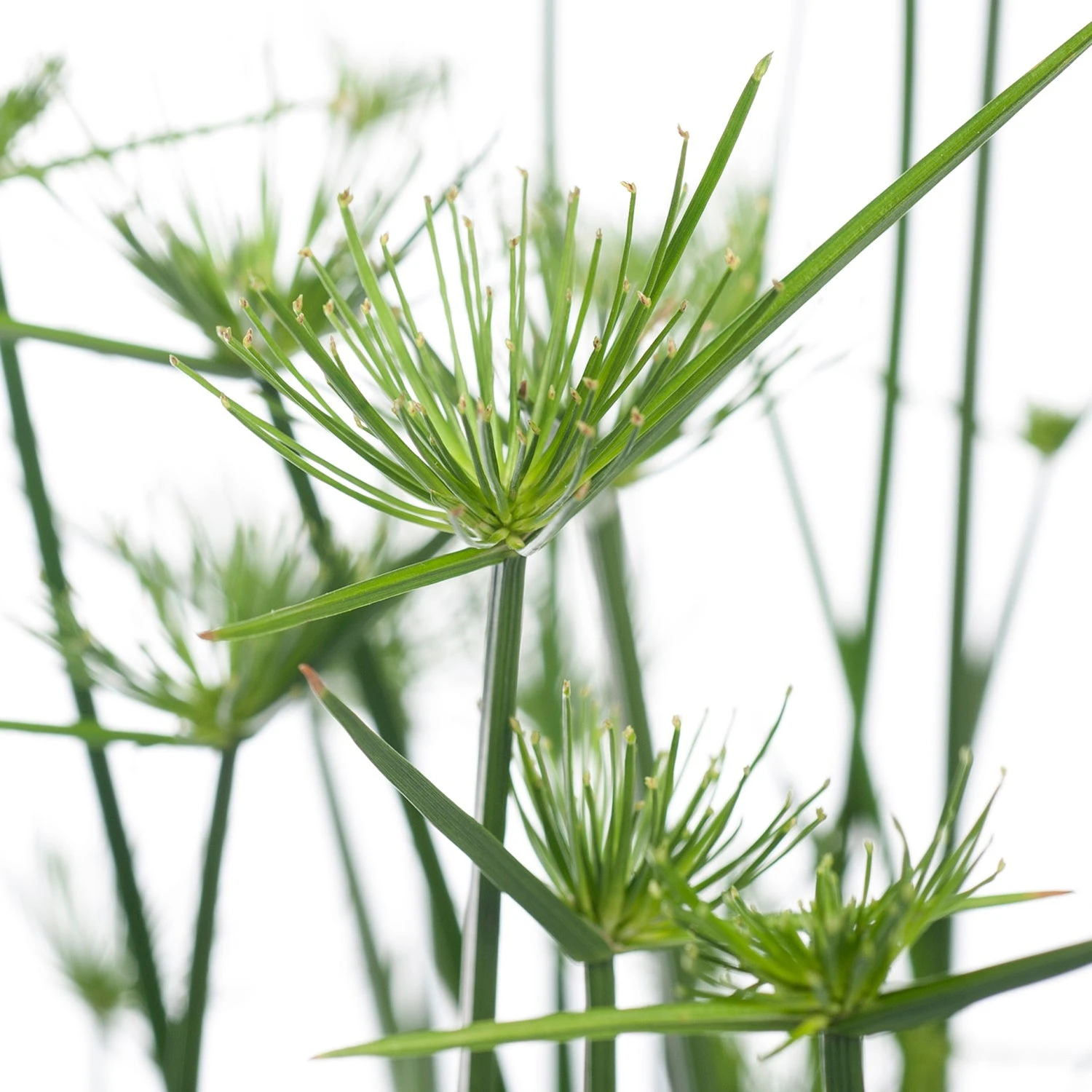 De Dwergpapyrus staat bekend om zijn parapluvormige plukken op hoge stelen, die eigenlijk kleine plantjes zijn. Deze plantjes faciliteren de vegetatieve voortplanting van de plant. Hoewel de bloemen onopvallend zijn, dragen ze bij aan de charme van de plant. Met een hoogte van 50 cm bij aankoop en een potmaat van 12 cm, is deze groene kamerplant een prachtige toevoeging aan elke ruimte.
