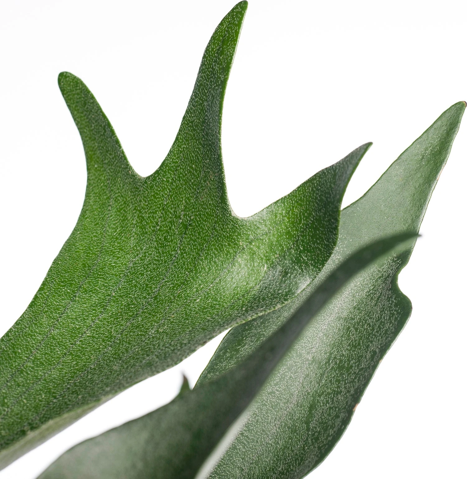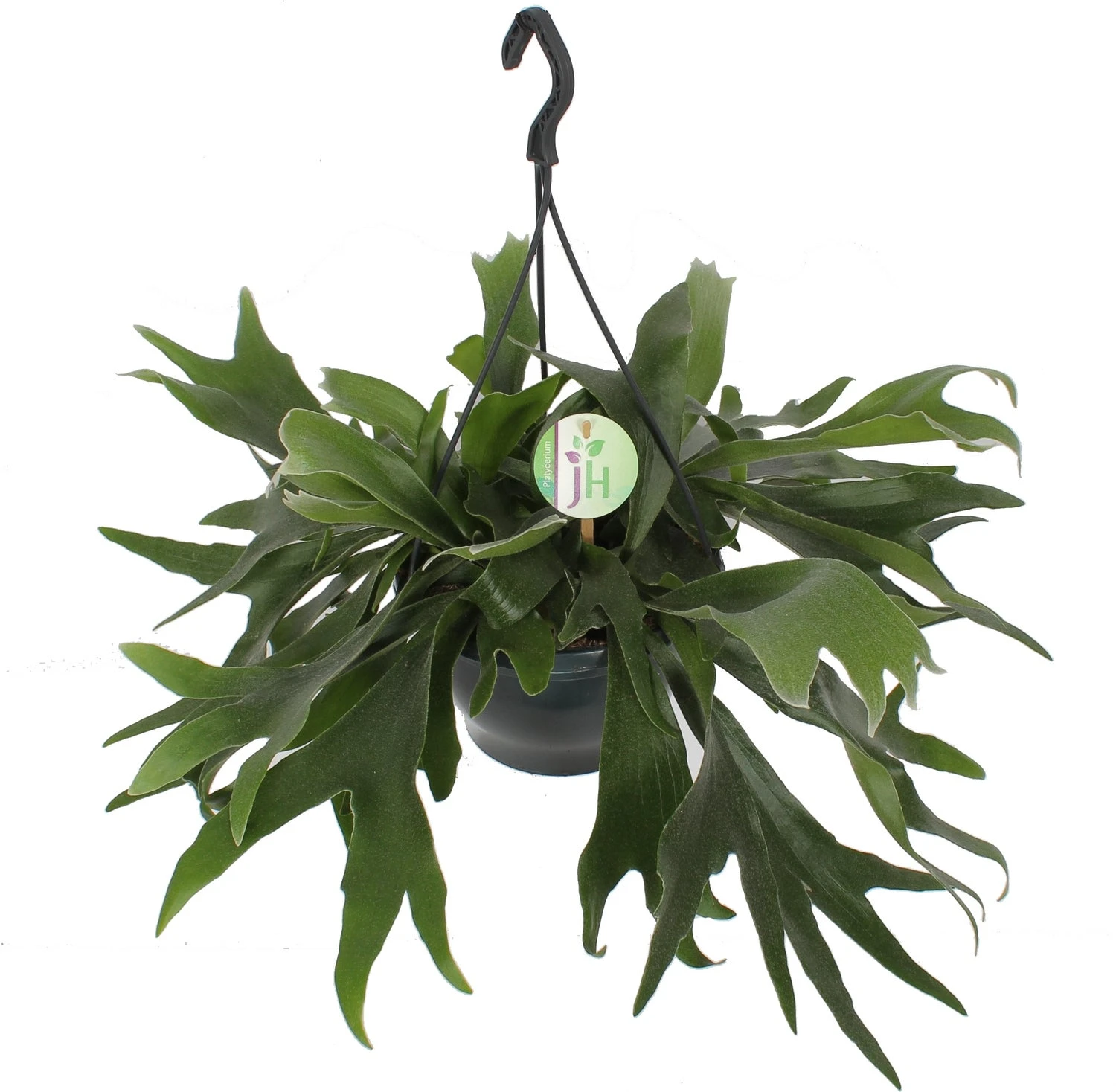 Ontdek de exotische schoonheid van de Hertshoornvaren (Platycerium bifurcatum), ook bekend als elandhoornvaren of geweivaren. Deze unieke kamerplant, met zijn opvallende gewei-vormige bladeren, is een ware blikvanger in elk interieur. De zachte, pluizige laag op de bladeren helpt de plant om minder water te verdampen, waardoor hij ideaal is voor binnenshuis. De Hertshoornvaren is niet alleen een prachtige toevoeging aan je huis, maar ook gemakkelijk in onderhoud.