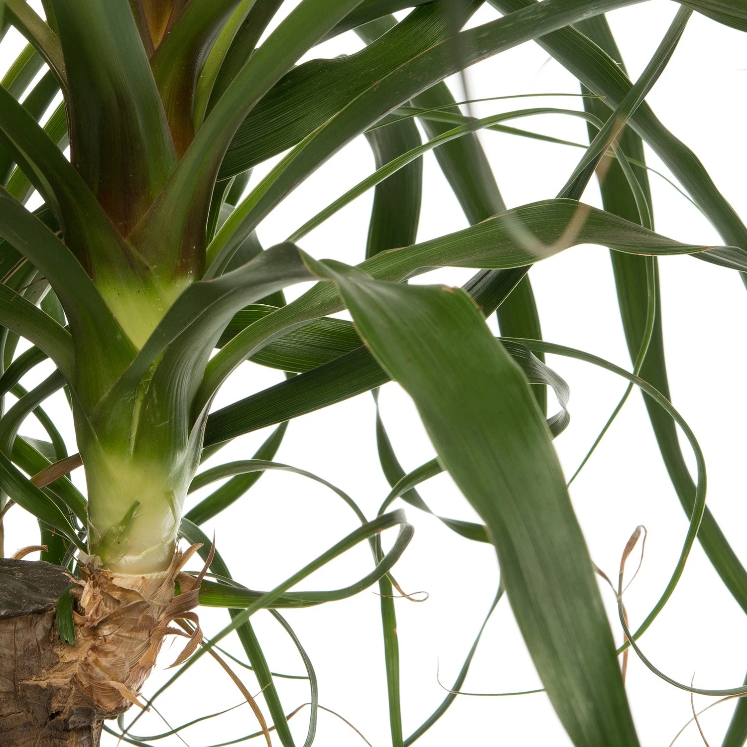 De Olifantenpoot (Beaucarnea recurvata) valt op door zijn robuuste, klolvormige stam die fungeert als waterreservoir. Hierdoor kan de plant goed tegen een periode van droogte. De bladeren zijn lang, smal en groen van kleur, en groeien sierlijk in een krullende vorm vanuit de top van de stam. Deze plant kan een hoogte bereiken van ongeveer 85 cm bij aankoop en groeit langzaam, wat hem een duurzame keuze maakt voor thuis of op kantoor.