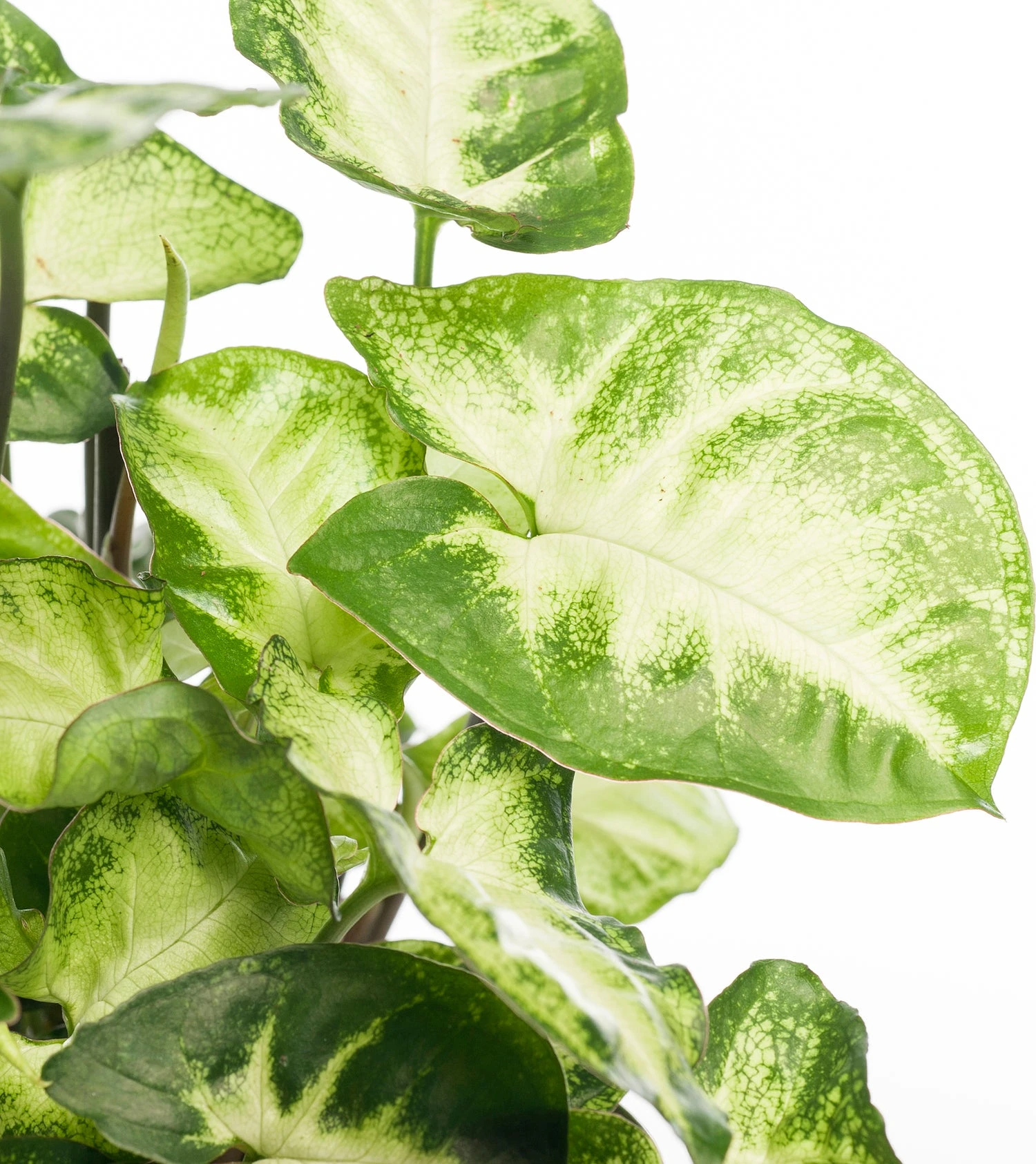 Het blad van de Syngonium ‘Pixie’ heeft in zijn bladvorm het meeste weg van de Aronskelk. In zijn jonge jaren heeft hij meer ovaalvormig blad en 1 blad per steel. Naarmate de ‘Pixie’ ouder wordt krijgt hij meer bladeren per steel en krijgen de bladeren meer een pijlvorming blad. Zorg voor voldoende water en vocht en je kunt genieten van deze prachtige bladplant die verder weinig eisen stelt aan zijn verzorging.