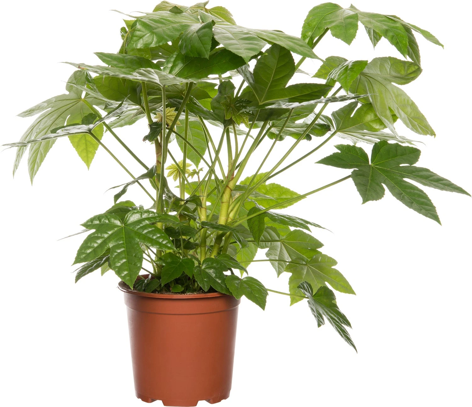 Vingerplant (Fatsia japonica), ook wel bekend als Japanse Aralia, is een prachtige groene kamerplant die met zijn unieke, diep ingesneden bladeren een exotische flair aan je interieur toevoegt. Deze van oorsprong Japanse plant is perfect voor liefhebbers van grote, opvallende bladeren en brengt een tropisch gevoel in elke ruimte.
