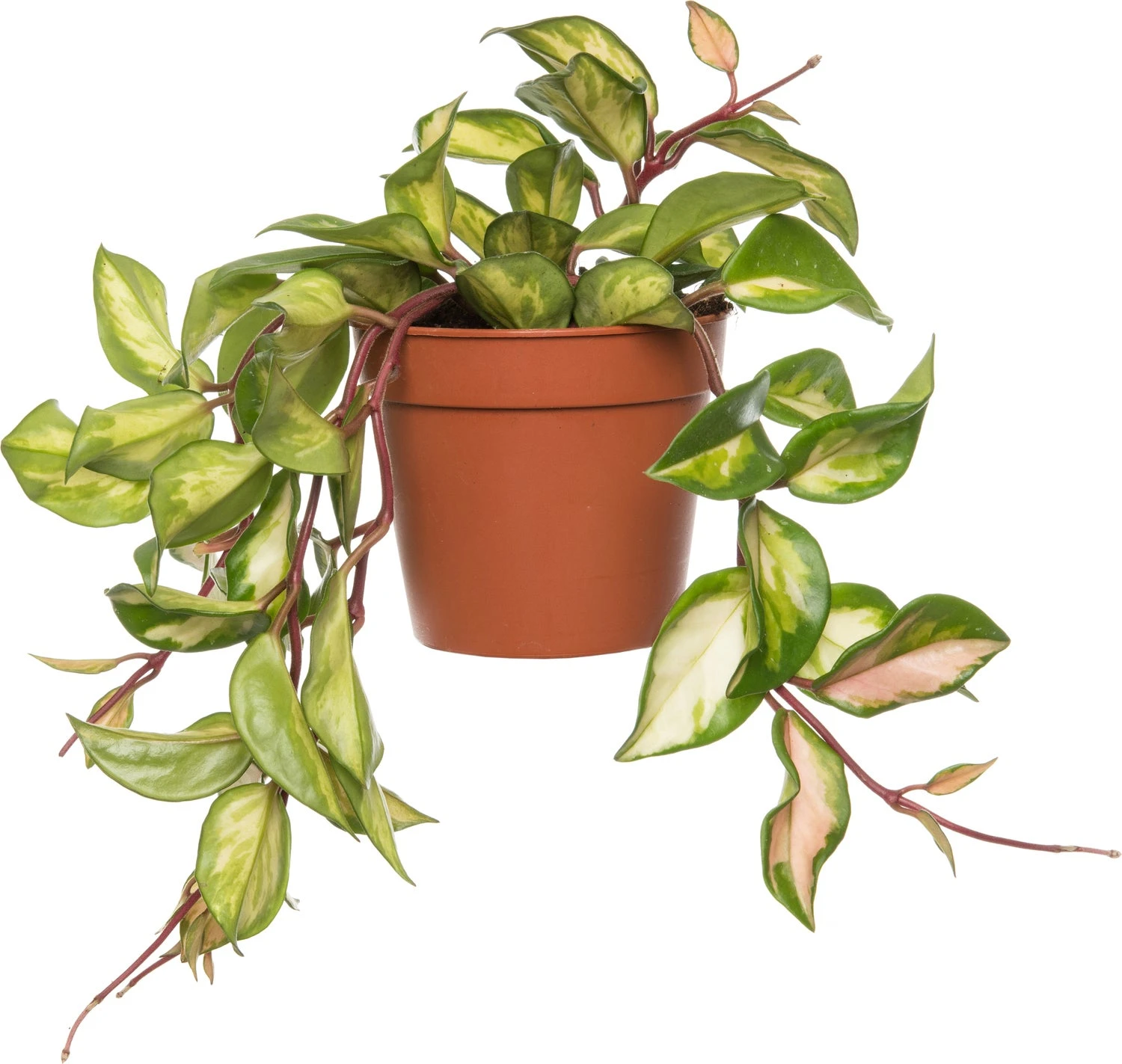 Langs hangende uitlopers zal de hoya stervormige bloemen in een scherm vormen. Deze bloemen geuren behoorlijk en niet iedereen kan deze intense geur genieten. Het blad van deze schoonheid heeft drie kleuren, groen, geel en licht roze.
